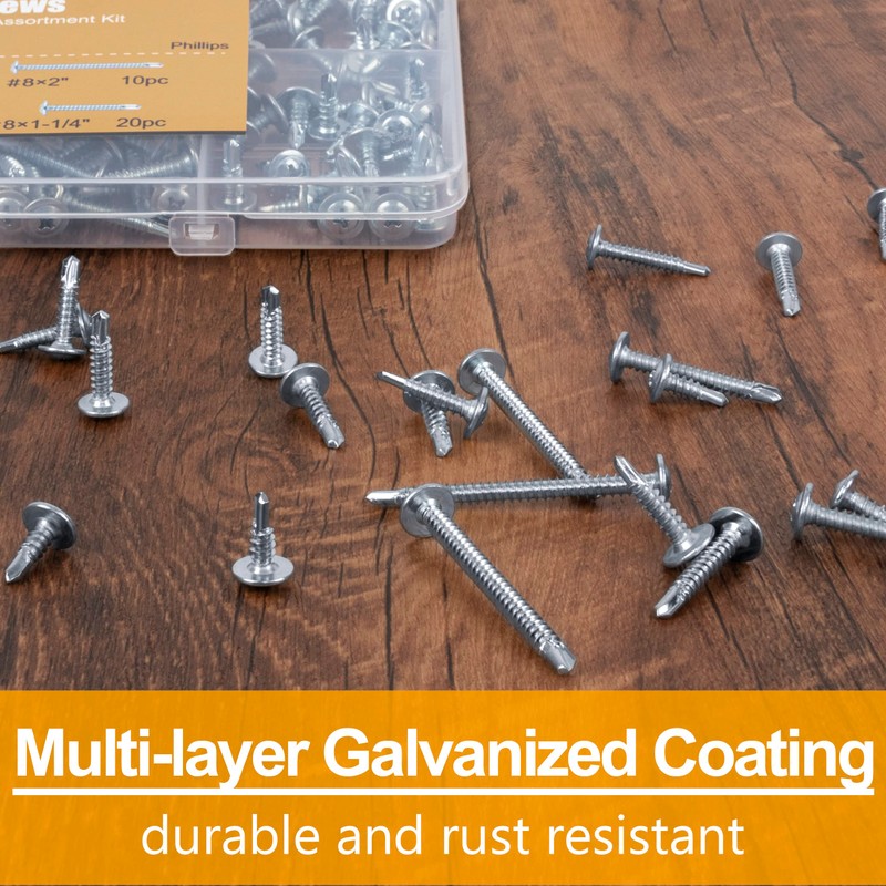 - ABUNDANT SIZE OPTIONS ?There are 5 size options for you to choose from in this self tapping screws assorted set, which are: #8*1/2", #8*3/4", #8*1-1/4", #8*1", #8*2". All screws of different sizes are well assorted in the clear organizer box, you can easily find the one you need in seconds.