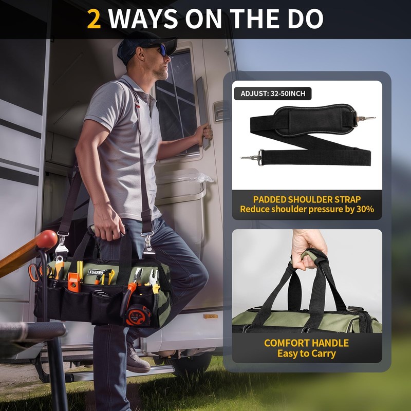 - Adjustable Padded Shoulder Strap: The large tool bag comes with a 32-50 inch adjustable shoulder strap for men of different heights; the staggered metal buckle design allows for easy opening and closing of the bag while wearing it, and the padded design on the shoulder strap effectively relieves shoulder pressure
