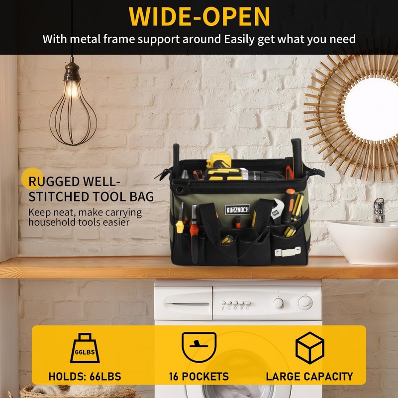 Kurznoch Tool Bag 15-Inch Large Tool Organizer Box 16-Pocket Portable Tote Waterproof Toolbag, Soft Padded Handle, Heavy Duty Zipper, Adjustable Shoulder Strap, with Black Small Tool Bag