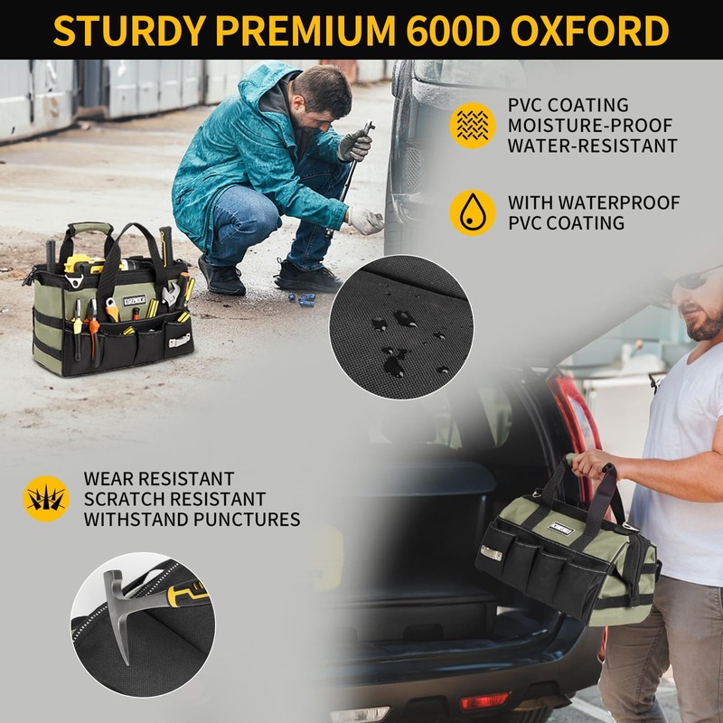 Made of extra-strong tear-resistant 600D Oxford cloth, this 15" tool bag organizer is sturble enough to carry your most important tools; features heavy-duty stitching, a large storage compartment with 16 pockets, a tape measure holder, and a sturdy shoulder strap; There's also a black small nylon mesh zipper bag for small parts or supplies