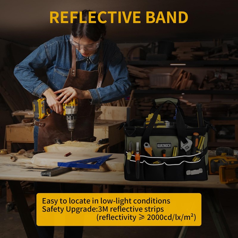 - Non-slip Base and Reflective Tape: This tool organizer bag has 4 rubber non-slip base to keep it stable and prevent accidental movement on a variety of surfaces; The reflective tape improves visibility in low-light conditions, allowing you to find what you need quickly and safely