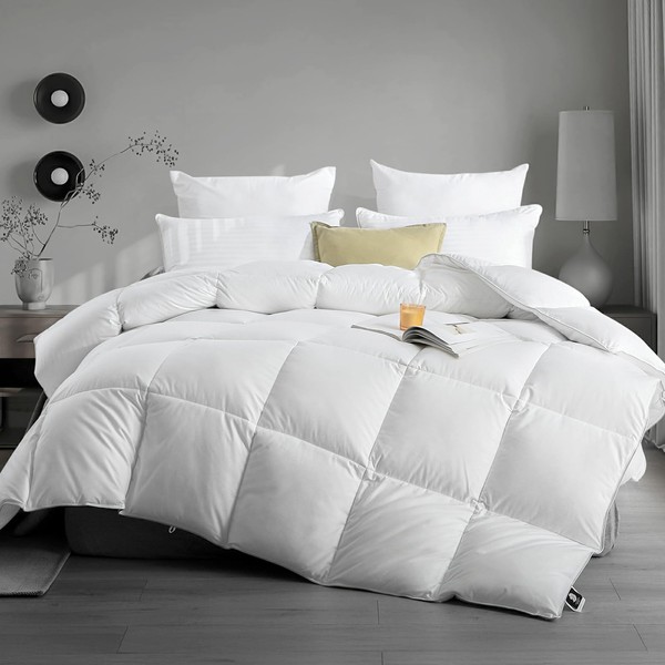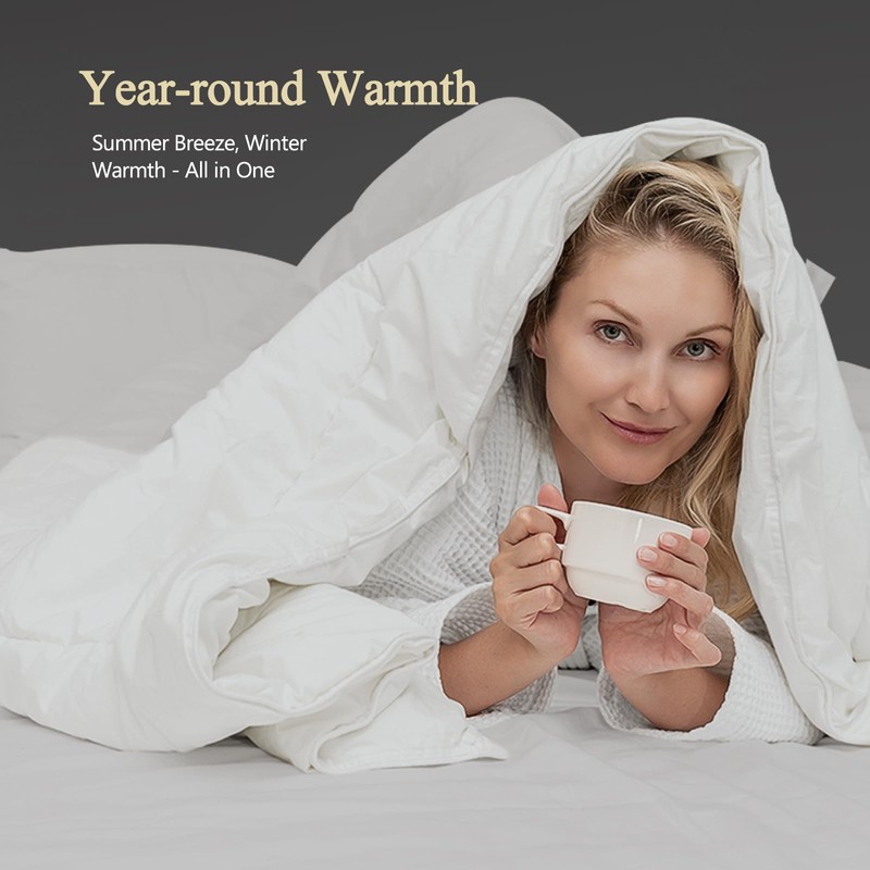 - All-Season Comfort --Medium fill weight balances warmth and breathability, perfect for year-round use. Because of the warmth and breathability of down, it locks in the body temperature and brings a warm and comfortable sleep experience without overheating whether it's spring, fall, winter or summer.