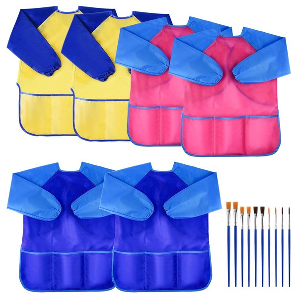 KUUQA 6 Pcs Waterproof Art Smock Kids Art Painting Aprons Long Sleeve with 3 Roomy Pockets and 10 Pcs Painting Brushes, Age 2-6 Years