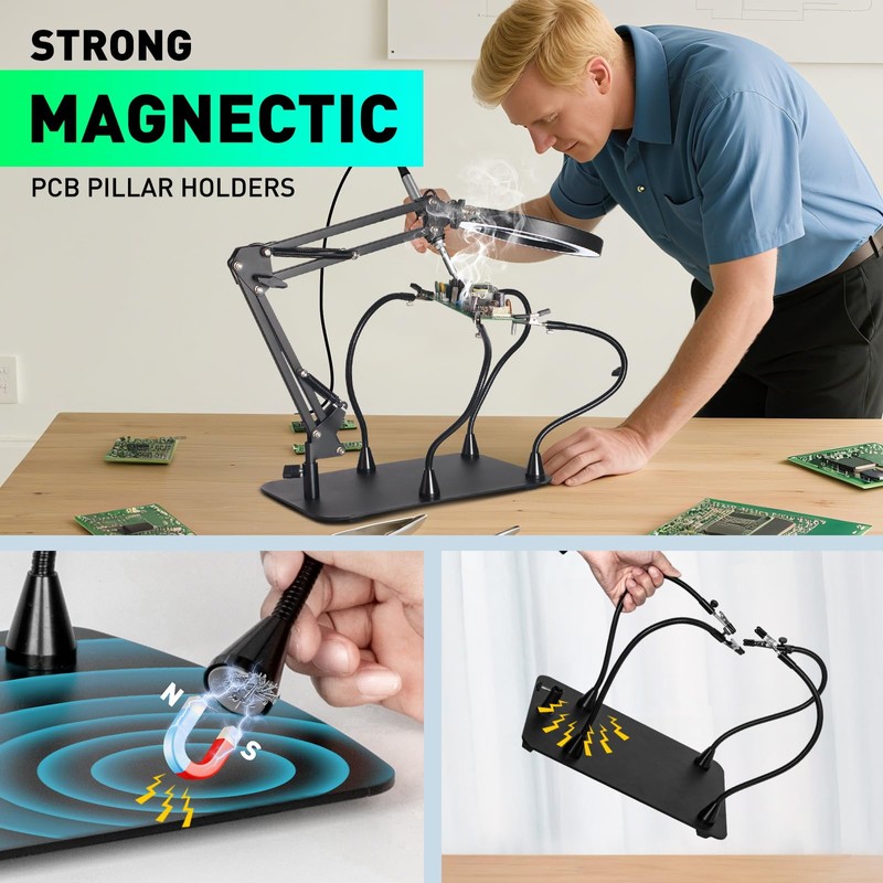 - 【4 Helping Hands tool & Alligator Clips】Helping hands soldering tool owns strong magnetic base that has powerful attraction to the metal and it can bent in any direction. Magnetic arms isn't easy to break and reusable. Alligator clips with non-slip rubber sleeves prevent the surface of circuit board from scratches and securely hold precision electronic parts.