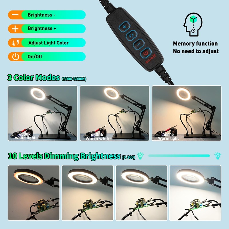 - 【3 Color Stepless Dimming】Magnifier lamp has 3 color and 10 brightness. The light is soft and flicker-free that provides you a comfortable working environment. Low power consumption increases the lamp's life expectancy, serving you for a long time.