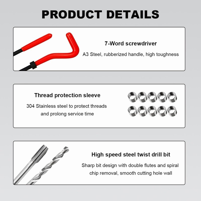 - 【Wide Application】: Our thread repair kit is suitable for a wide range of applications, including engine repair and other automotive uses. It is an ideal solution for thread repair, enabling users to easily and effectively restore or replace broken and stripped internal threads.
