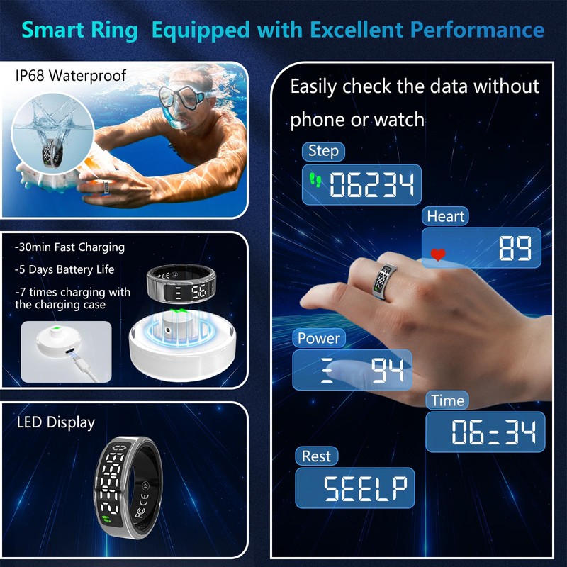- IP68 & 5ATM WaterproofSlimmed down to just 2mm thick and polished on the inside for comfort, the KVKVMO Smart Fitness Ring is water-resistant up to IP68 / 5ATM. It's safe for swimming, showering, diving, or intense workouts. With its sleek and lightweight design, it's not just a smart deviceit's a fashionable accessory for everyday wear