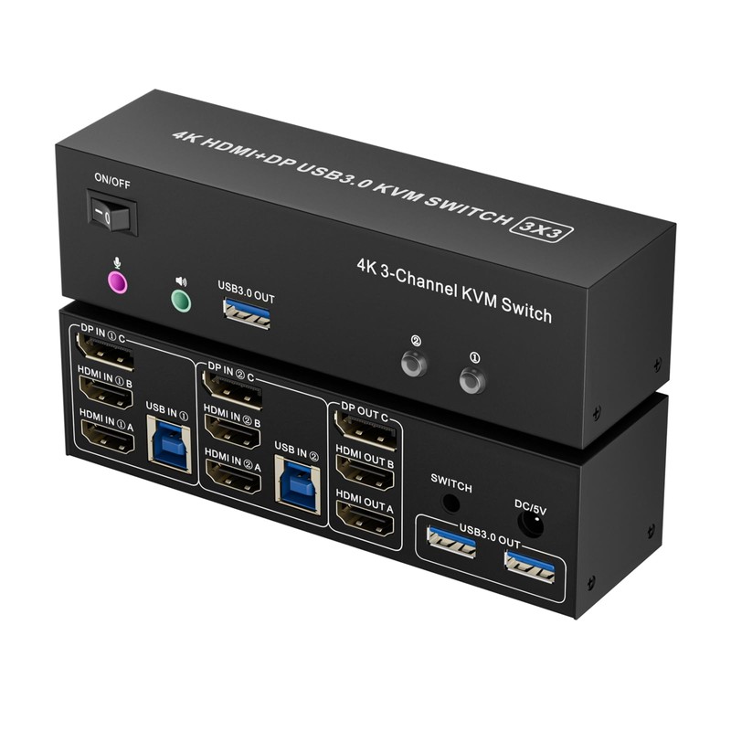 KVM Switch 3 Monitors 2 Computers 4K@60Hz,HDMI + 2 Displayport USB 3.0 KVM Switches with 3 USB 3.0 Ports, Audio Microphone, Headphone Jack, Shared Keyboard (4K 2 PC 3