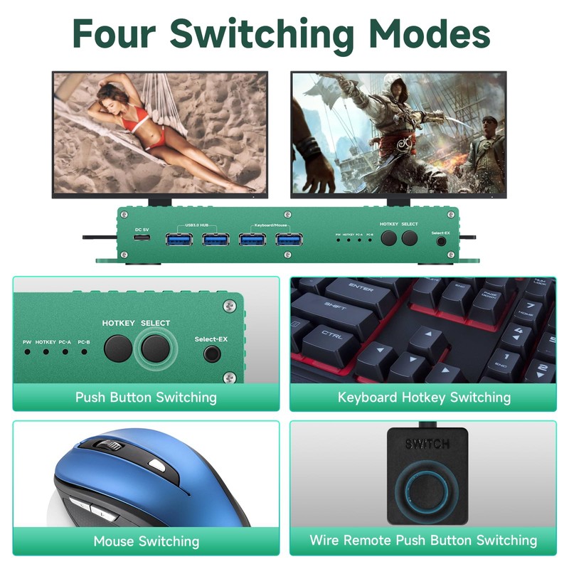 - hdmi displayport kvm Switch 2 Monitors 2 Computer 144Hz SWITCH Mode: the Dual Monitor kvm Switch displayport 4k 144hz Supports Four switching methods to meet with different needs, including keyboard hotkeys, mouse hotkeys, push button, wired remote ; switching only takes several seconds after first set-up;