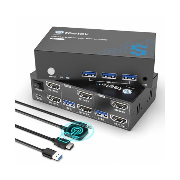 Streamline your multi-monitor workspace with this versatile KVM switch that lets you control two computers using a single keyboard, mouse, and dual display setup. Perfect for professionals who need to multitask between different systems, this switch eliminates desk clutter and the need for duplicate peripherals. Supporting dual monitor configurations, you can extend your workspace across two screens while seamlessly switching between computers with simple controls. The switch maintains high resolution output for crystal clear visuals across both displays. Ideal for home offices, professional workstations, or any setup requiring efficient management of multiple computers. Save time and boost productivity by instantly switching your entire workspace between systems instead of juggling multiple input devices. This KVM solution offers a practical way to maximize desk space while maintaining full functionality of your dual-monitor computing environment.