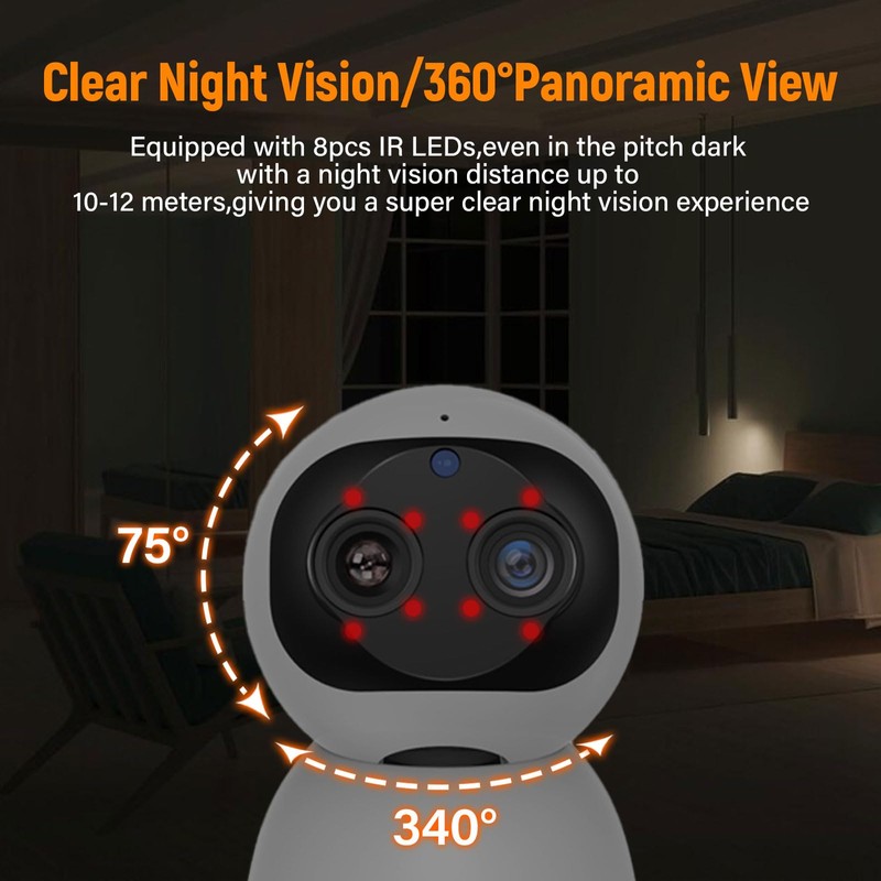 - 360° coverage and 2.4 GHz WiFi: indoor surveillance camera with horizontal 340° and vertical 75° function for complete coverage of your home without blind spots. Provides 360° protection for your home. It automatically follows the moving person or object until the surveillance camera can no longer rotate or the object disappears from the field of view of the camera. 2. 4G WiFi WiFi ConneActivity (not compatible with 5G)