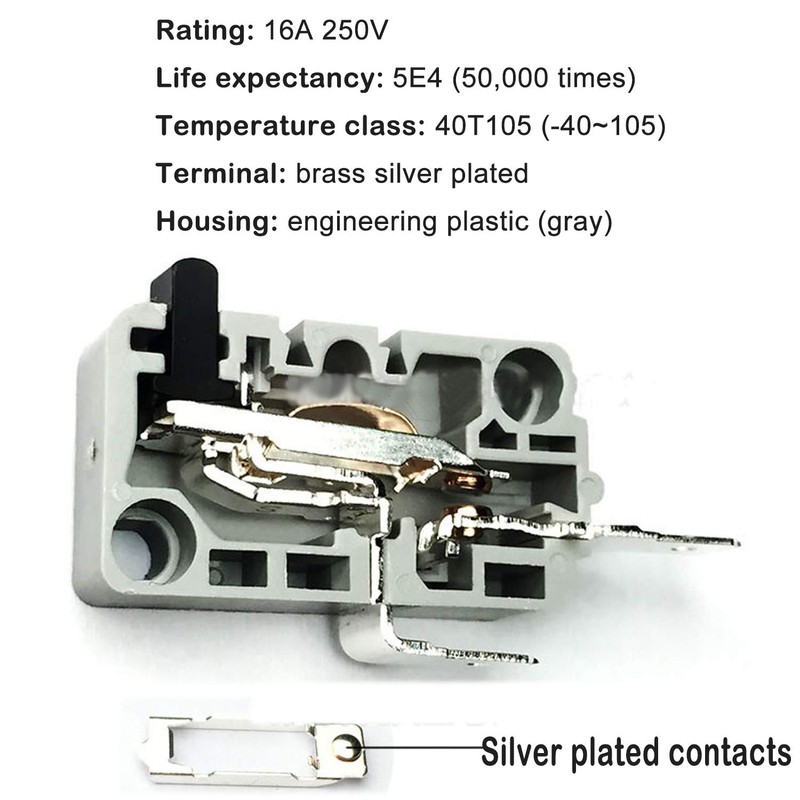 KW3A - safe and reliable basic switch Specification: Color: Grey Material: Plastic Current: 16A Voltage: 125V and 250V Temperature resistance: 105° Features: - Beautiful appearance and compact structure. Features a small contact gap, fast action, high sensitivity and small motion stroke - Long life and reliable - Use thermosetting or thermoplastic materials Package Included: 2 pc KW3A microwave door switch(1 normally open + 1 normally close)