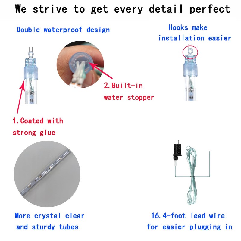• 【High Quality & Safe Guarantee】Made of premium PC material that is transparent and firm; double waterproof setting, ideal for indoor & outdoor decorations; a round hook is on top of the tube for easy hanging; 16.4-foot leading wire allows for easier connection to a socket; powered by 7V low voltage that is lower than human body safe voltage for safe use, we've thought of every detail for you.