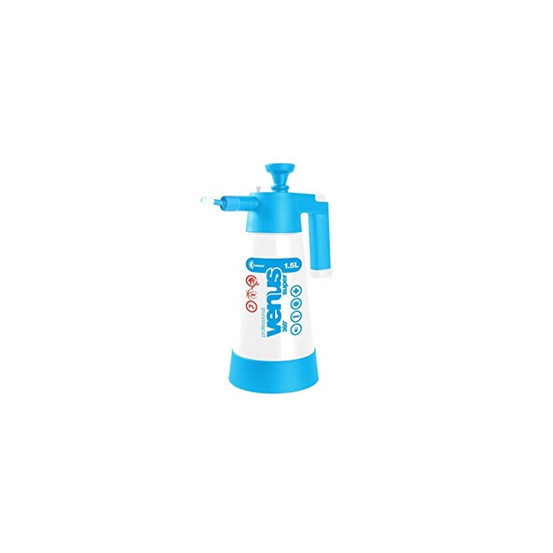 Zware kwaliteit handsprayer geschikt voor intensief gebruik. Handig 360 graden functie om ook ondersteboven te kunnen sprayen. Verstelbare spuitmond. Ingebouwde veiligheidsklep die de druk boven 3 bar afblaast. Inhoud: 1500ml. De Kwazar Venus Super 360 PRO+ is een handige handpomp sprayer voor intensief gebruik. Geschikt om producten als All-Purpose-Cleaners, glasreinigers, detailsprays e.d. te vernevelen. Verlicht het werk enorm bij intensief gebruik doordat je geen sprayer hoeft te bedienen. Dankzij een uniek systeem is deze handpomp sprayer zelfs ondersteboven te gebruiken! Het spuitmondje is in alle richtingen in te stellen. Voorzien van veiligheidsklep die de druk boven 3 bar afblaast. Ook is de fles voorzien van een kijkstrip met maatverdeling zodat je goed kan zien hoe vol de fles is en maakt het verdunnen gemakkelijk. Dit product bevat: - 1500 ml Kwazar Blue Venus Super 360 Pro+ HD Handpomp Sprayer Productcode: 202-6030-01-0081