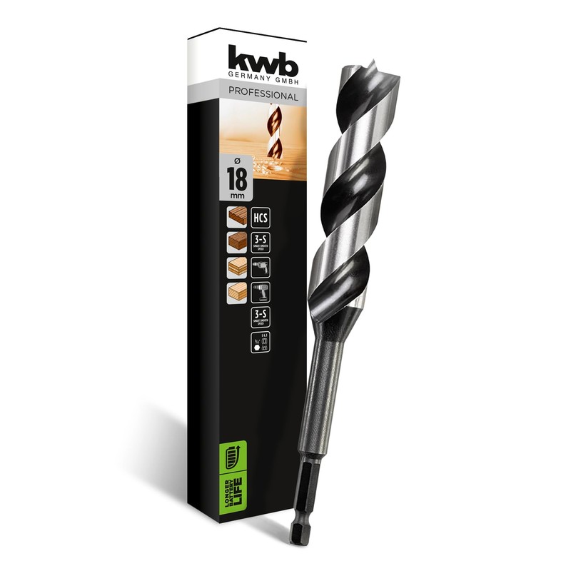 - The drill bit from kwb drills through hardwood up to 2x as fast as standard augers.