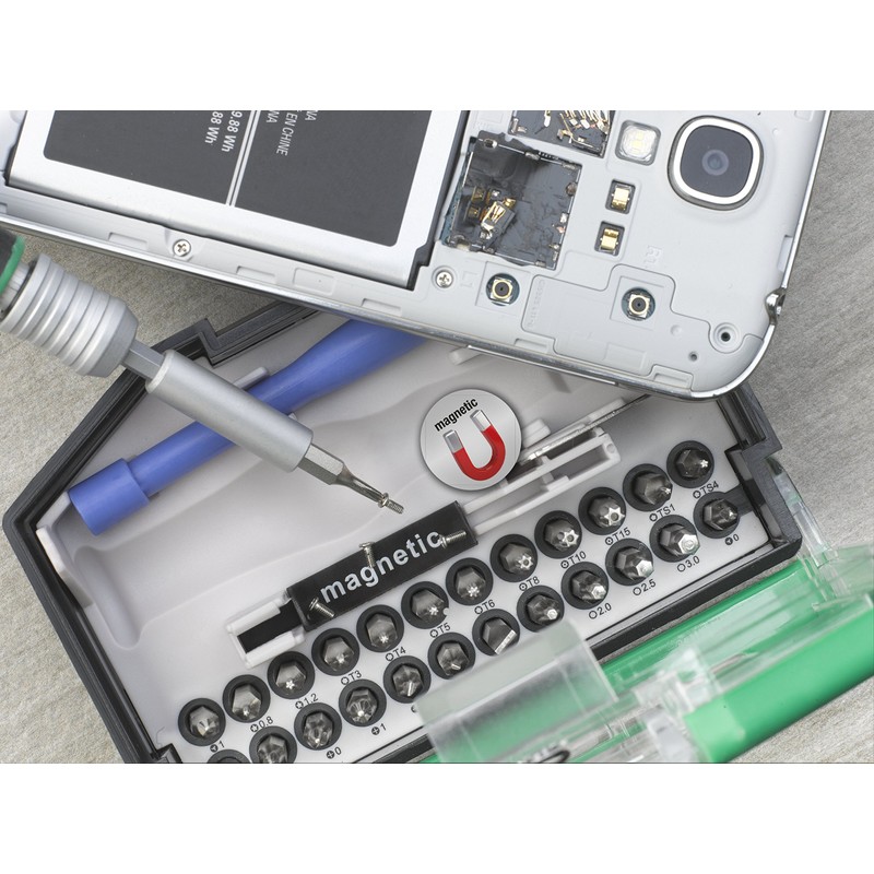 • Comprehensive set, consisting of special microbits, bits, suction lifter, plastic lever, SIM key, tweezers and bit holder with handle in robust plastic box with practical belt clip