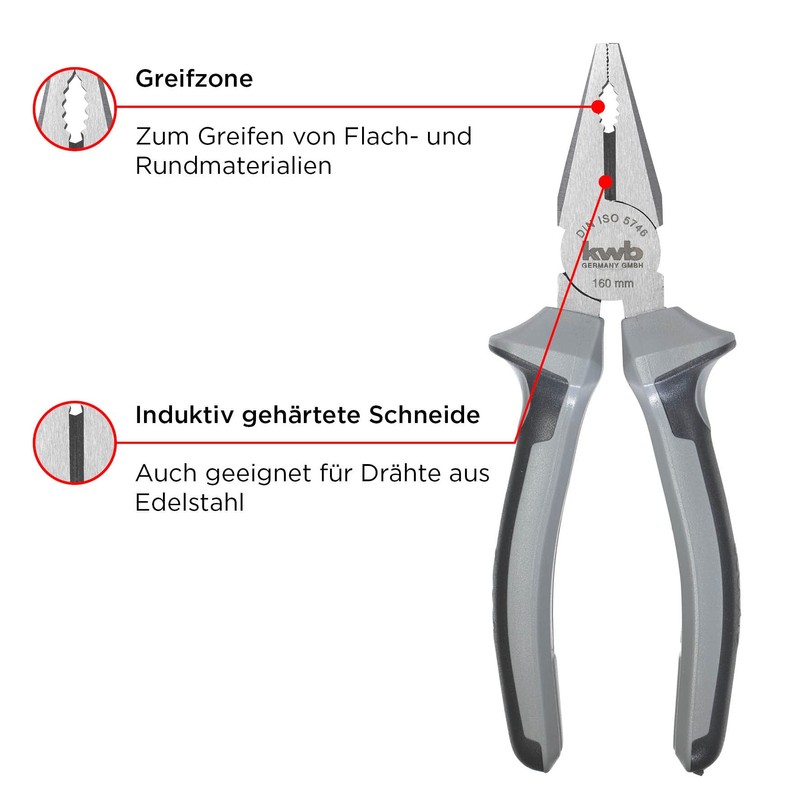 kwb Combination Pliers in 180 mm, Made in Germany with 2-Component Handle with Hand Guard, Made of Anti-Glare Carbon Steel, with Grip Zone and Hardened Cutting Edges, Conforms to DIN ISO 5747