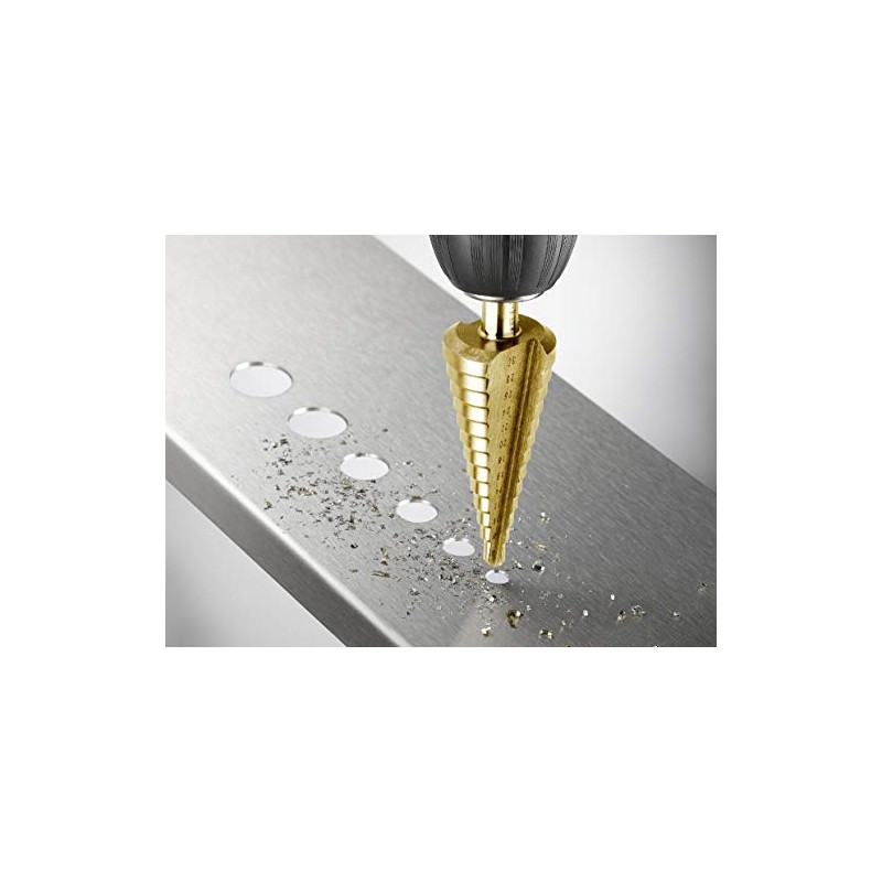 - Step drill bit made of high-quality HSS steel for drilling high-alloy steels and stainless steels, as well as various non-ferrous metals and plastic