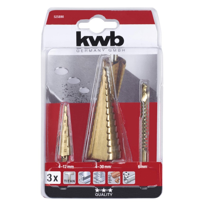 kwb Step Drill Bit Set with Milling Drill Bit 1 x 4 - 12 mm, 1 x 4 - 30 mm, 1 x 6 mm, Titanium Nitrided Surface