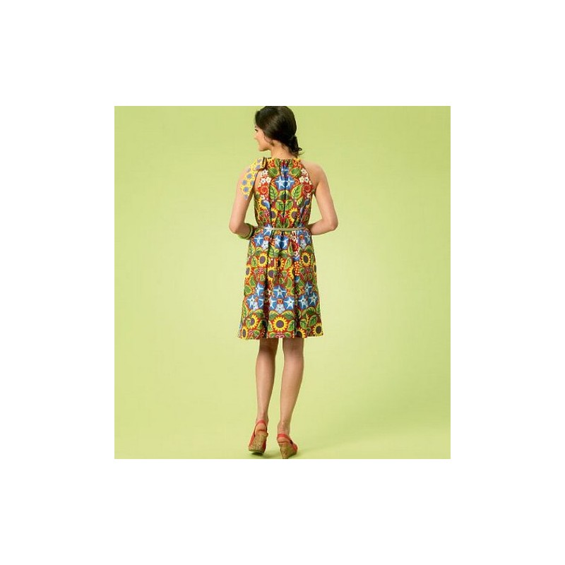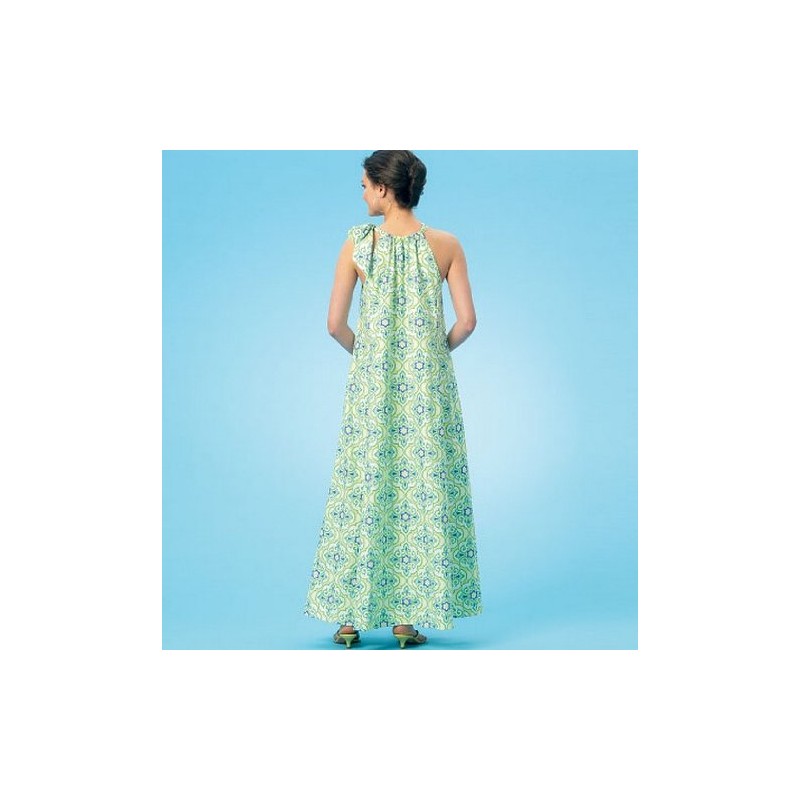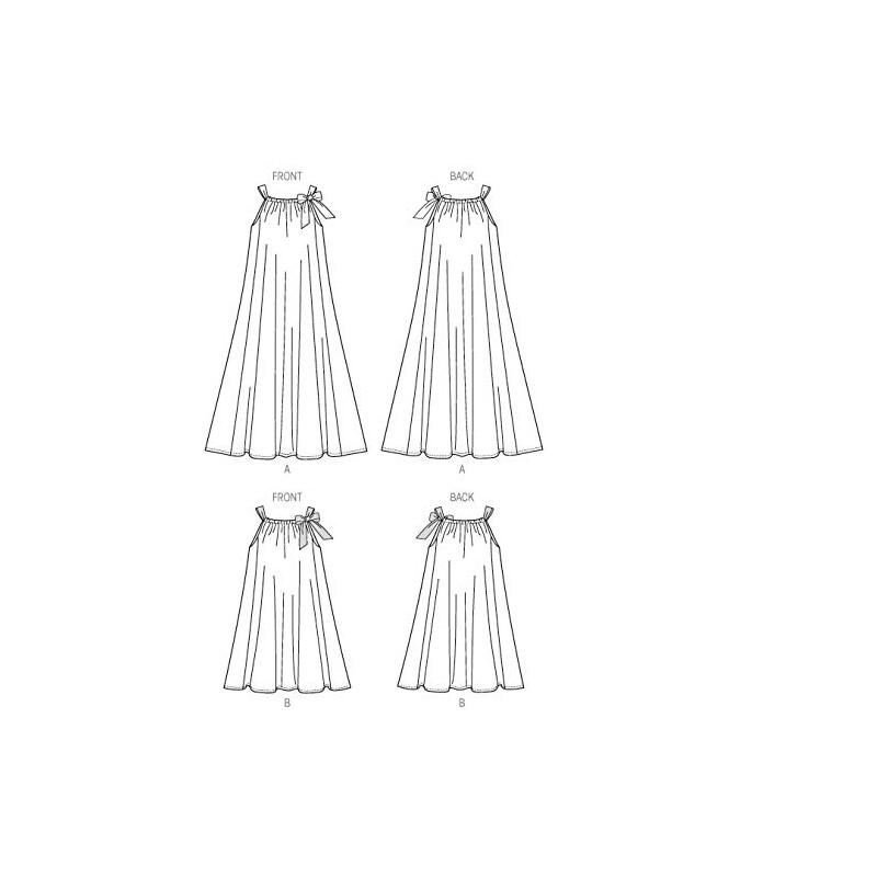 Princess-line dresses tie in casing at neckline which gathers front and back, have armhole and necklines finished with facing, side seam pockets and ties at one shoulder into a bow. FABRICS: Designed for lightweight woven fabrics. Suggested Fabrics: Cotton, linen, rayon, challis.