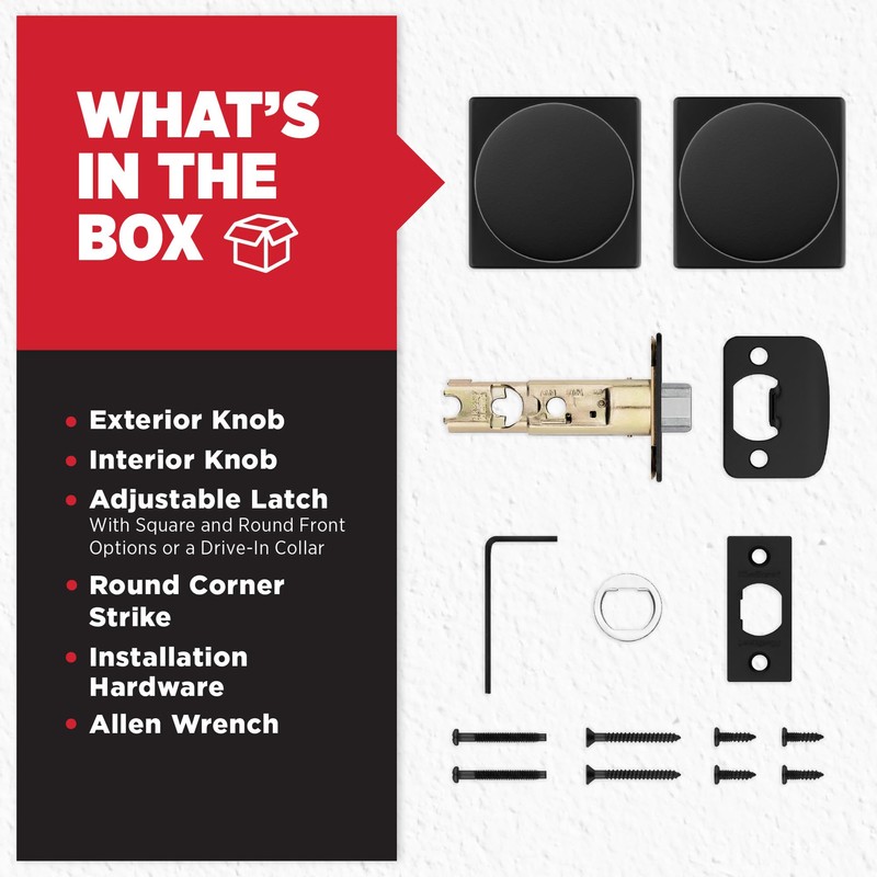 - BOX INCLUDES: Exterior and Interior Knobs, Screws, Adjustable Latch, Strike Plate, Installation Hardware, Install Guide