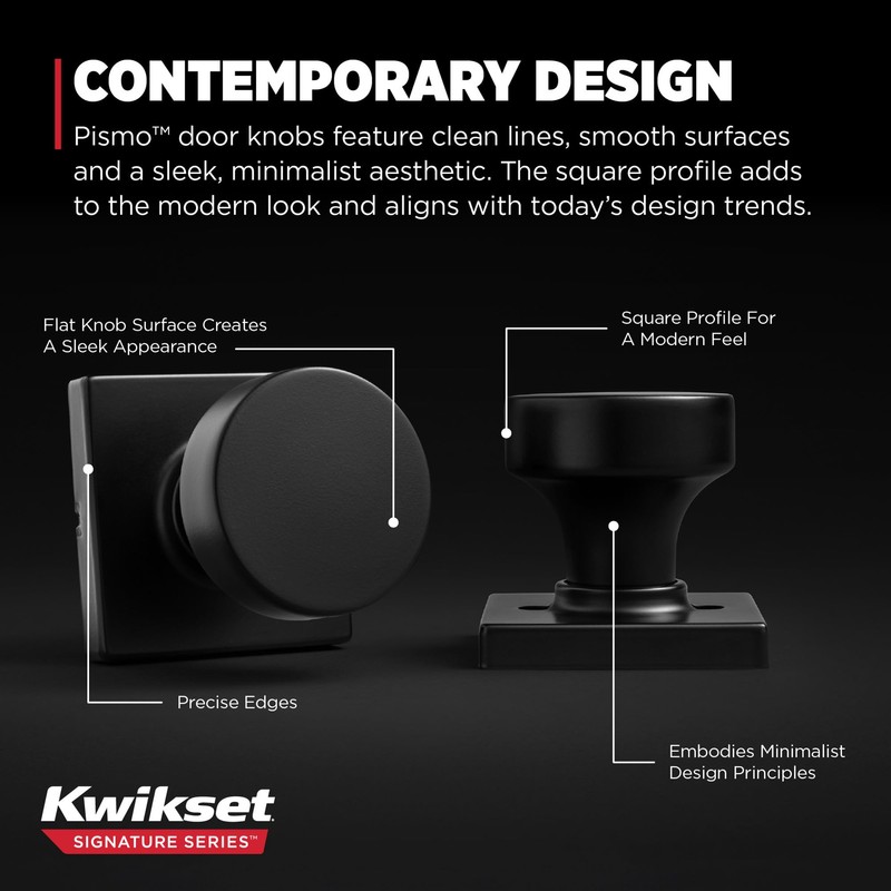 Kwikset Pismo Interior Passage Door Knob, Handle For Closet and Hallway Doors, Non-Locking Doorknob in Matte Black, with Microban Protection, Square Rose