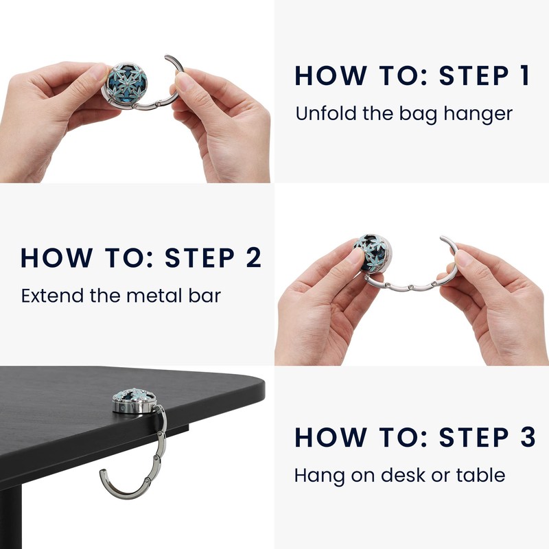 - COMPACT & PRACTICAL: Thanks to its compact size, the bag hanger can be stored in your bag and is easy to carry. Hook can be folded to save space when not in use