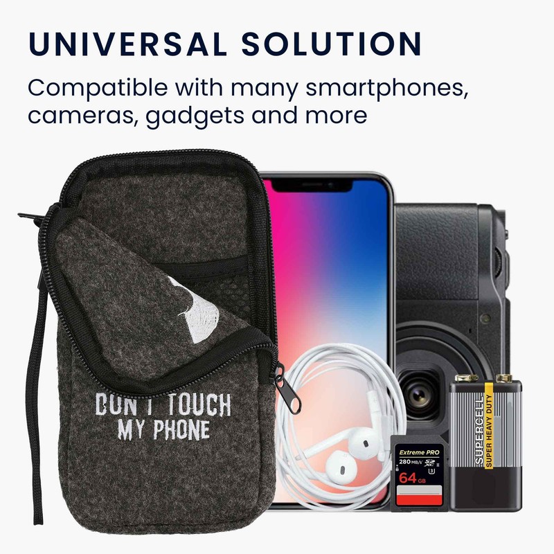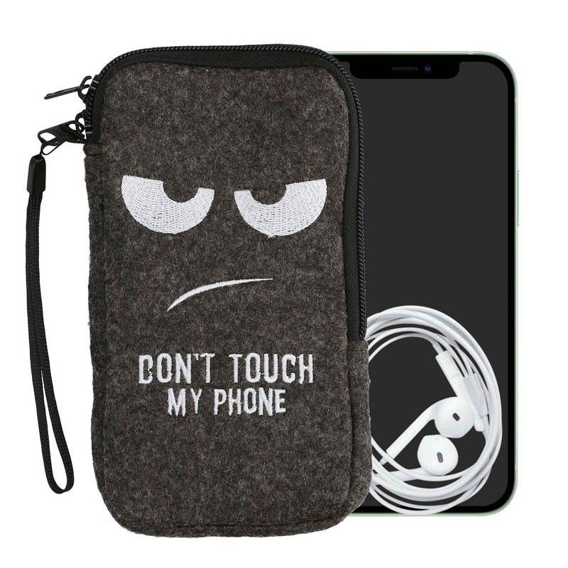 - EMBROIDERY: Felt sleeve with sewn-on Don't Touch my Phone design; measures 16.5 x 8.9 cm inside