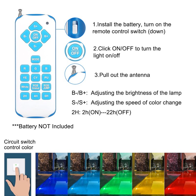 - Widely used: the remote control remembers the last colour; you can also control the light colour via the power switch; effective control distance of the antenna: 20-50 m. (There is a switch on the right side of the remote control, which can only work when the switch is on.)