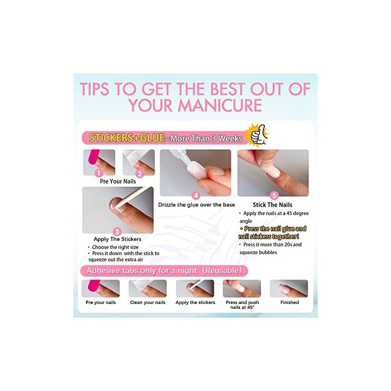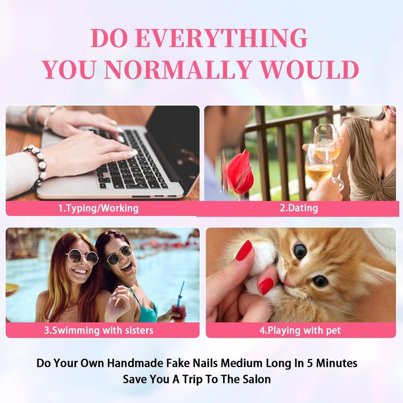 - Polish-Free DIY Gel Nails Manicure: Made by premium quality material, These glue on nails medium length could bring you brilliant shine surface, smooth appearance and flawless coverage. Achieve an amazing gel shine glossy effect with ready-to-wear gel nails. Takes only minutes to apply with nail glue or adhesive tabs. If you want it Lasts for up to 30days with no chipping or smudging, please use nail glue(not included). The application and soak off process is easy! Save your precious time!