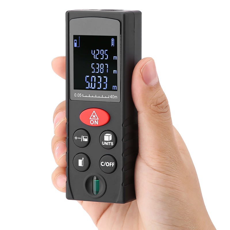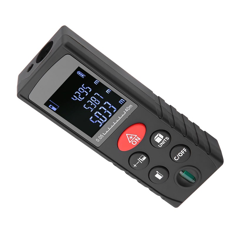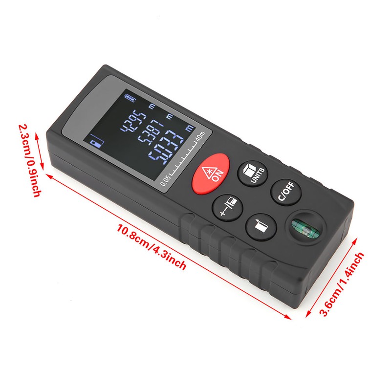 1、Mini digital laser rangefinder with angular indication, accurate measurement. 2、High accuracy laser range finder can be used to measure distance, area and volume. 3、Compact size and portable design, convenient to carry. 4、Adopt LCD backlit display, convenient to read data in the dark. 5、The instrument can be widely used in building and industry, especially in the room, apartment buildings, factories and other large area.