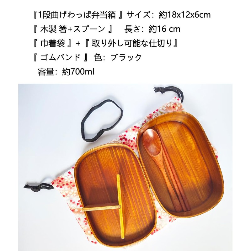 KXLCGYK Magewappa Bento Box, Oval 23.7 fl oz (700 ml), 1-Tier, Lightweight, Mag Wappa Set, Natural Lacquered Rice, Bento Box, Tableware, Pink Flower Drawstring Bag, Wooden Spoon and Chopsticks