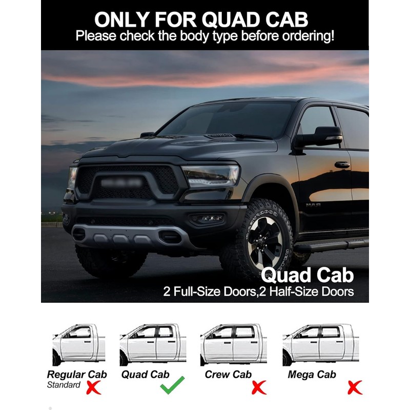 - Custom Fit:Vehicle specific for 2019 2020 2021 2022 2023 2024 Ram 1500 New Body Quad Cab Only.2019-2024 Ram 1500 classic are excluded