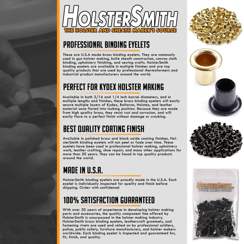 HolsterSmith professional-grade kydex eyelets are designed to roll-over (or "flare") perfectly when used with quality Kydex eyelet flaring tools, and will create the perfect head finish demanded by professional and DIY holster makers when used for material binding. HolsterSmith tactical black coated brass kydex eyelets are the best-quality, and most precise in the industry. They are used daily by top custom kydex holster makers and government contractors around the world. We have been supplying our tactical black coated kydex eyelets to custom kydex and leather holster builders, military suppliers and law-enforcement professionals for over two decades. HolsterSmith kydex eyelets have been tested and approved by the most demanding consumers on the planet, those who put their lives on the line every day.