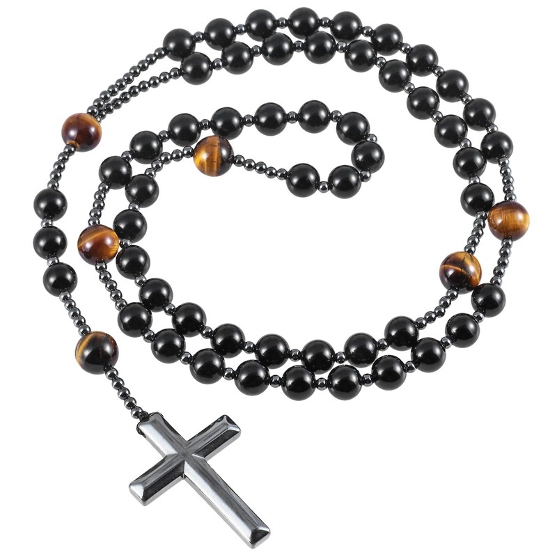 KYEYGWO Hematite Long Beaded Cross Necklace for Men Women, Catholic Rosary Necklace for Faith Prayer Protection, Obsidian & Tiger's Eye Stone