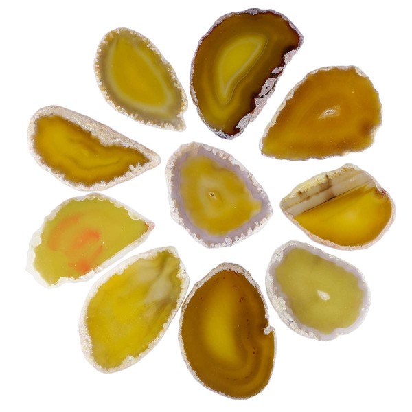 KYEYGWO Pack of 10 Irregular Geode Agate Discs without Holes, Polished Agate Gemstone Healing Crystal for Home Decoration, Jewellery Making, DIY and Healing Stone Name Cards, Yellow