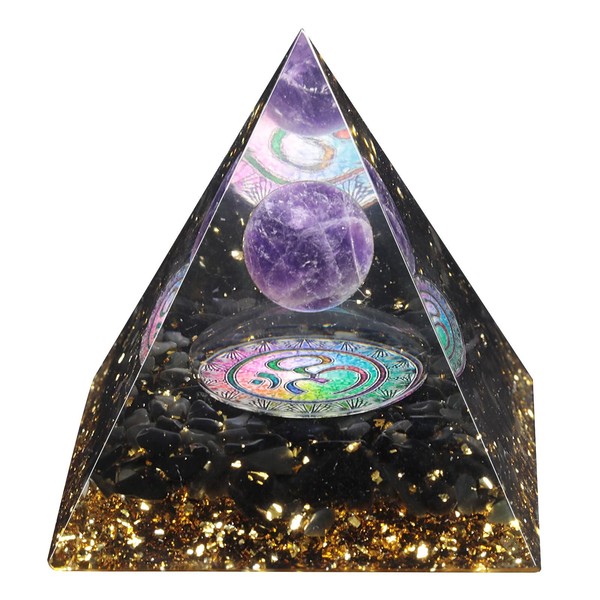 KYEYGWO Positive Energy Pyramid Stone with Reiki Healing Amethyst Crystal Ball and Reiki Symbol, Chakra Crystal Pyramid Obsidian Healing Stone Pyramid Desktop Ornament Home Decoration