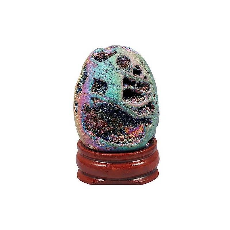 KYEYGWO Titanium Coated Agate Geode Egg Figure with Wooden Stand, Oval Crystal Ball Sculpture Egg-shaped Stone Fengshui Ornament Healing Stone Druze Gemstone Cluster House Decor, Colourful