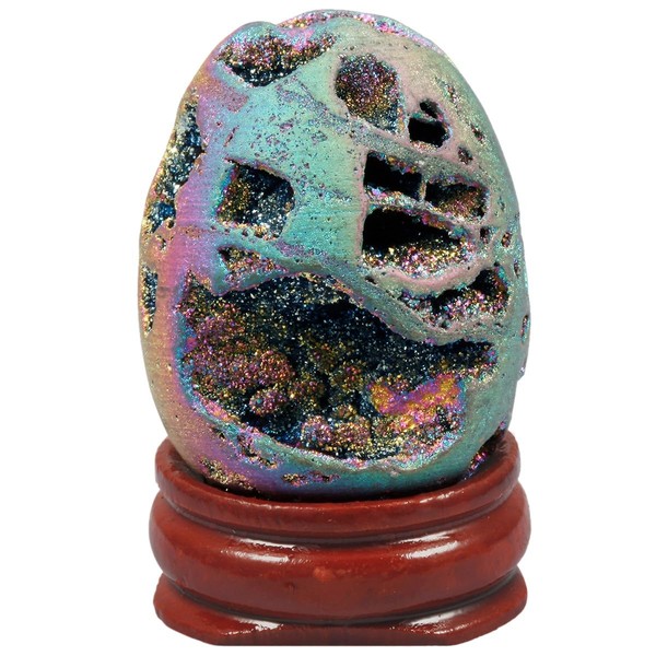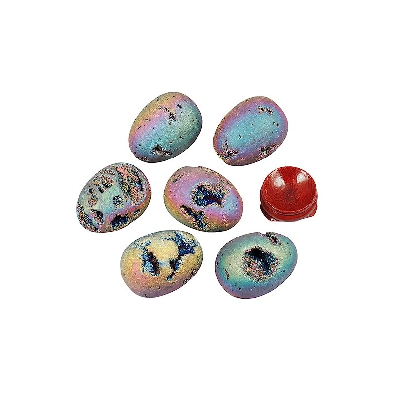 - Titanium coated crystal druse egg figure: the quartz crystal cluster has been treated in a special process in which a molecular layer of titanium and other metals has been fused with the surface of the natural agate druse. This leads to a permanent colouring of the surface and creates a colourful effect. Titanium quartz brings happy, positive energy and gives you the power and strength to overcome challenges.