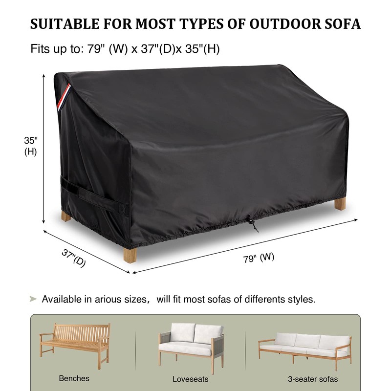 - Perfect Fit For Your Loveseat- Our outdoor sofa covers are designed to fit most types of sofas including love-seats, benches and 3-seat sofas, Please measure your sofa for best fit to ensure it stays in place and provide maximum protection before choosing. Our patio sofa covers measures 79W x 37D x 35H inches which can perfect fit sofas ranging from 77”-79”W,35”-37”D and 35”H.