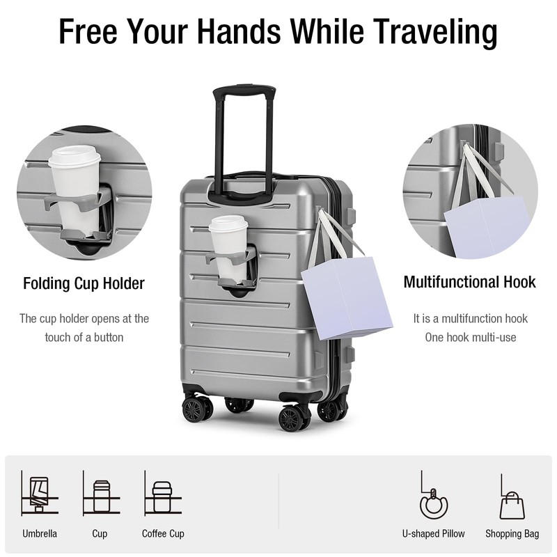 KYME Hard Shell Carry On Luggage 22x14x9 Airline Approved with Cup Holder,22 Inch Travel Rolling Suitcase with TSA Lock & Spinner Wheels,Silver