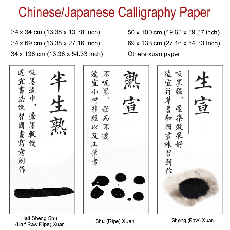 - HALF SHENG SHU (HALF RAW RIPE) XUAN PAPER: 半生熟 The half sheng shu (half raw ripe) xuan are with moderate ink imbibition and slow infiltration, which is suitatble for Chinese brush painting,writing,Kanji and Japanese calligraphy practicing