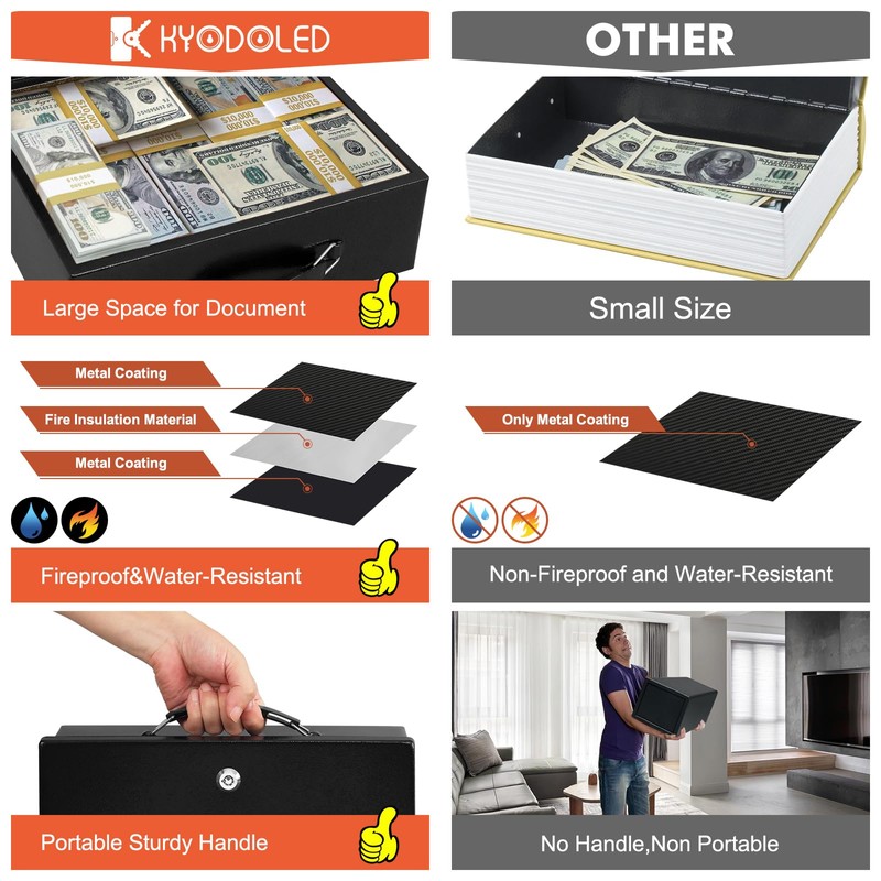 - FIREPROOF INSULATION: KYODOLED fireproof storage safe box is made of sturdy double cold rolled steel construction and is equipped with fire resistant insulation.It will keep your valuables safe, organized and conveniently portable!