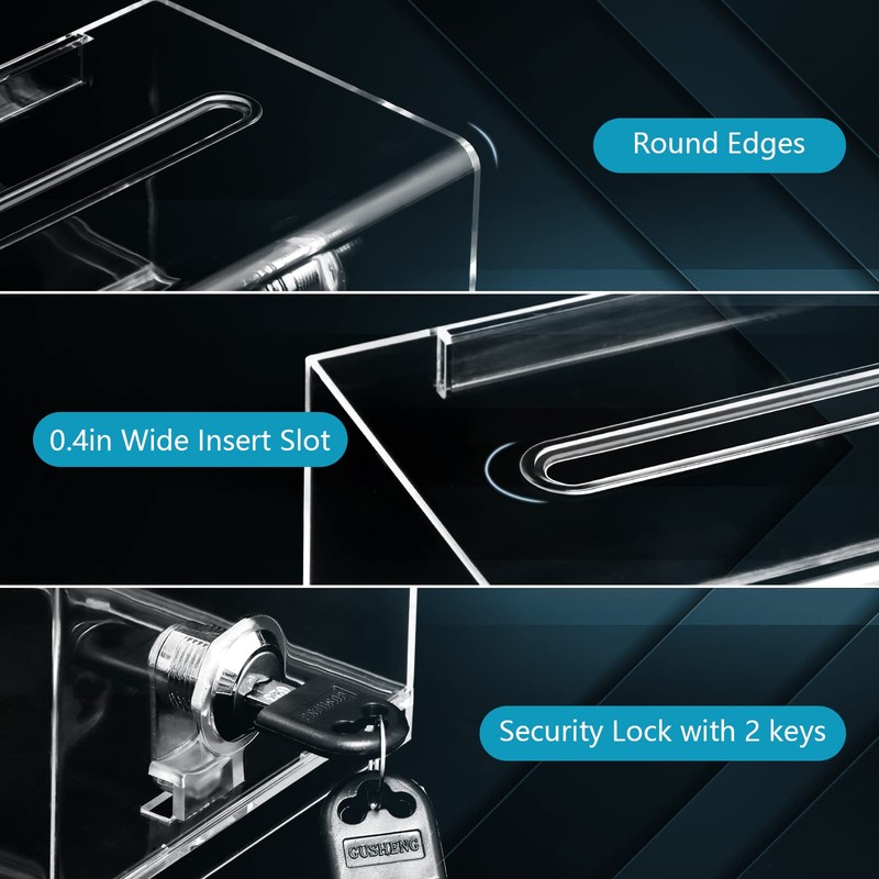- Versatile Applications: Our donation box has a wide range of uses. It is suitable for donation collection, gathering opinions, receiving suggestions, and more. It is also an ideal as a money box for cash. Whether it's in an office, school, community center, or any other setting, our suggestion box is a versatile tool that can meet various needs.