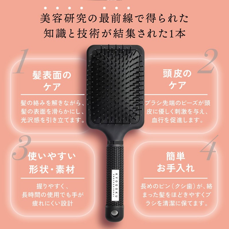 - KYOGOKU Paddle Brush Features: The KYOGOKU paddle brush is a cushioned brush that can be used to brush the shape of the scalp. Furthermore, the pins are soft, so it is less likely to put strain on your hair when combing tangled hair, and it is resistant to static and friction. Using the Tongton and scalp massage, the blood circulation of the scalp
