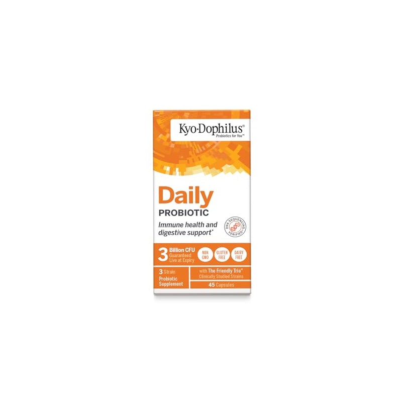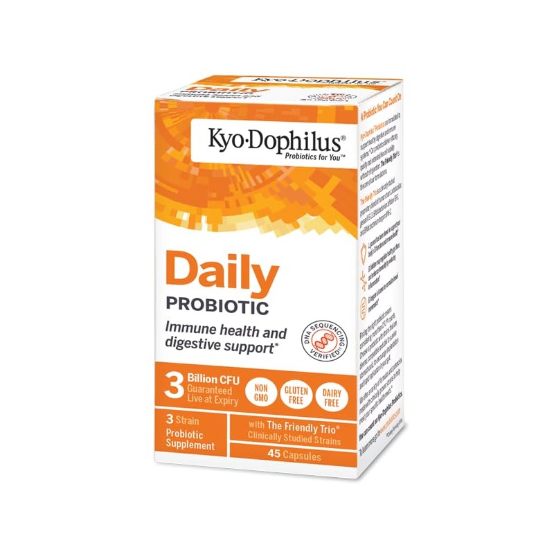 Suplemento probiótico Promueve una función intestinal saludable. Digestión y Salud Inmunitaria* Restaurar Equilibrio. Proteger Kyo-Dophilus está formulado con tres cepas especialmente cultivadas, humanas, no lácteas, resistentes al calor, resistentes al ácido estomacal de bacterias beneficiosas, este Friendly Trio te da alivio de los inconvenientes causados por las bacterias malas, Toma Kyo-Dophilus durante y después de un ciclo de medicamentos, cuando viajas, y todos los días para aumentar la inmunidad, promover la función intestinal saludable y el bienestar general*. Estable garantizado en el momento del consumo. Sin lácteos. *Estas declaraciones no han sido evaluadas por la Administración de Alimentos y Medicamentos. Este producto no está diseñado para diagnosticar, tratar, curar o prevenir ninguna enfermedad.