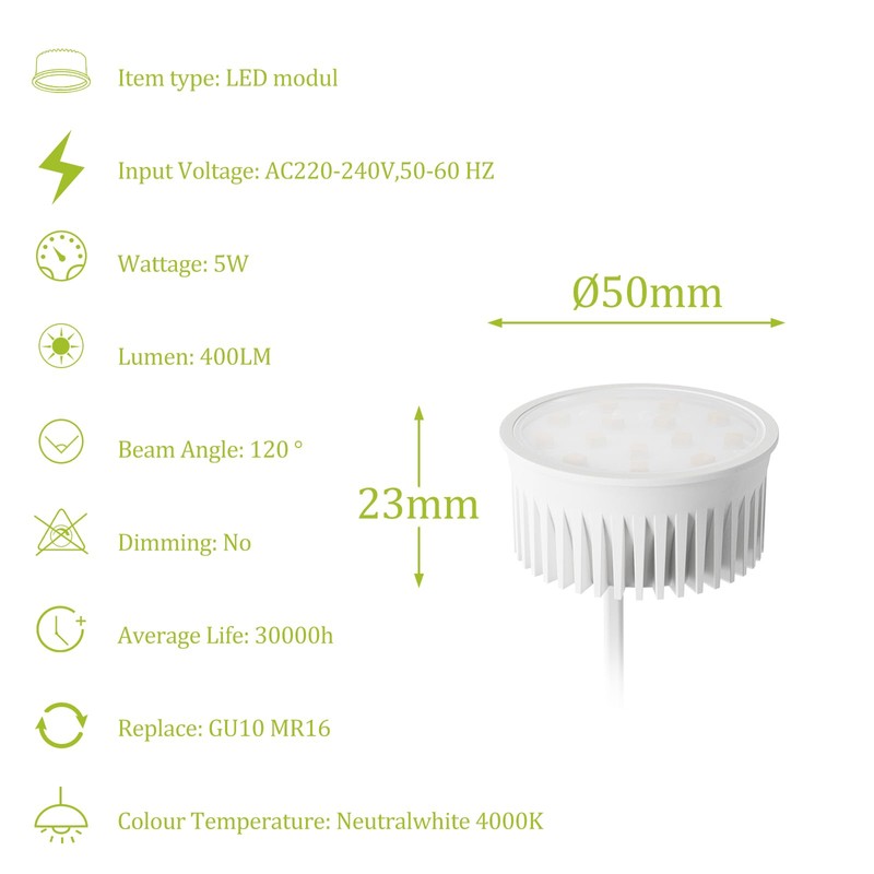 - GU10 replacement: with a diameter of 50 mm, the LED module is the ideal replacement for GU10 or MR16 bulbs especially for recessed spotlights / recessed light frames.