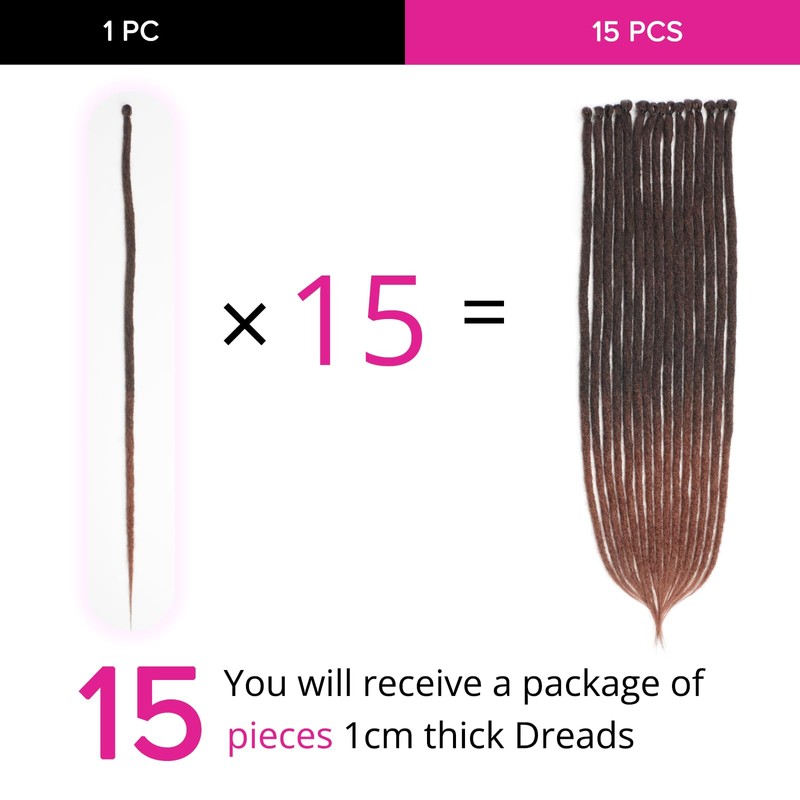 - 【Package】Each package has 15 individual extensions in total(15 Dreads/Pack). The single ended dreads have a loop at the top for temporary braid in application or crochet onto existing dreadlocks. These synthetic dreadlocks are around 1cm thick and 24inches/ 61cm long. 1 SE = 1 End; 15 pieces means 15 Ends.