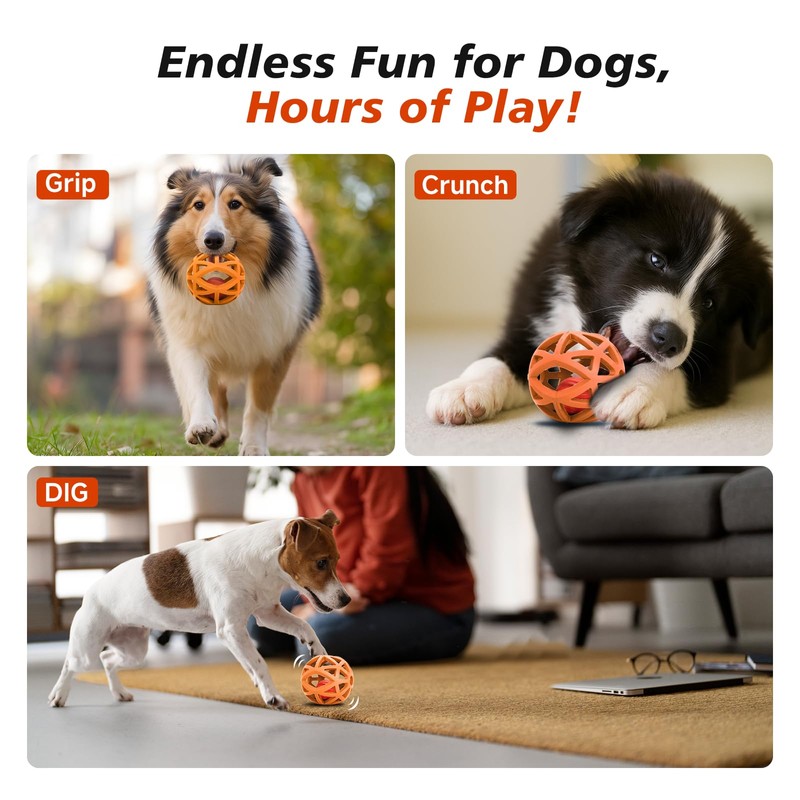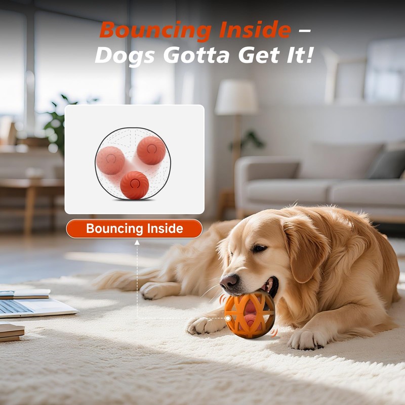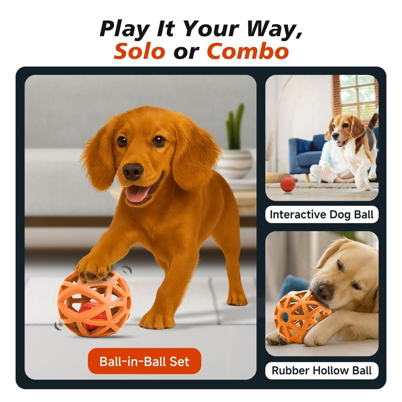 - 【Ball in Ball Design】:A smart bouncing ball is securely enclosed within a rubber shell, creating a unique "ball in ball" structure. This design keeps your dog mentally stimulated as they chase, paw, and try to retrieve the inner ball—without ever getting it out!