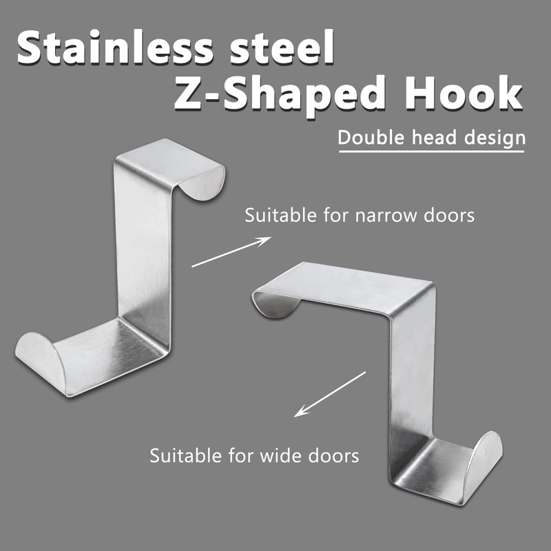 • Easy to Use: You just put the Z-shaped hanging hooks on the top of your cabinet or door, no need to stick, no screws or nails. The door hook can be used on the doors of two thicknesses, and the durable structure can be hung anywhere at will.